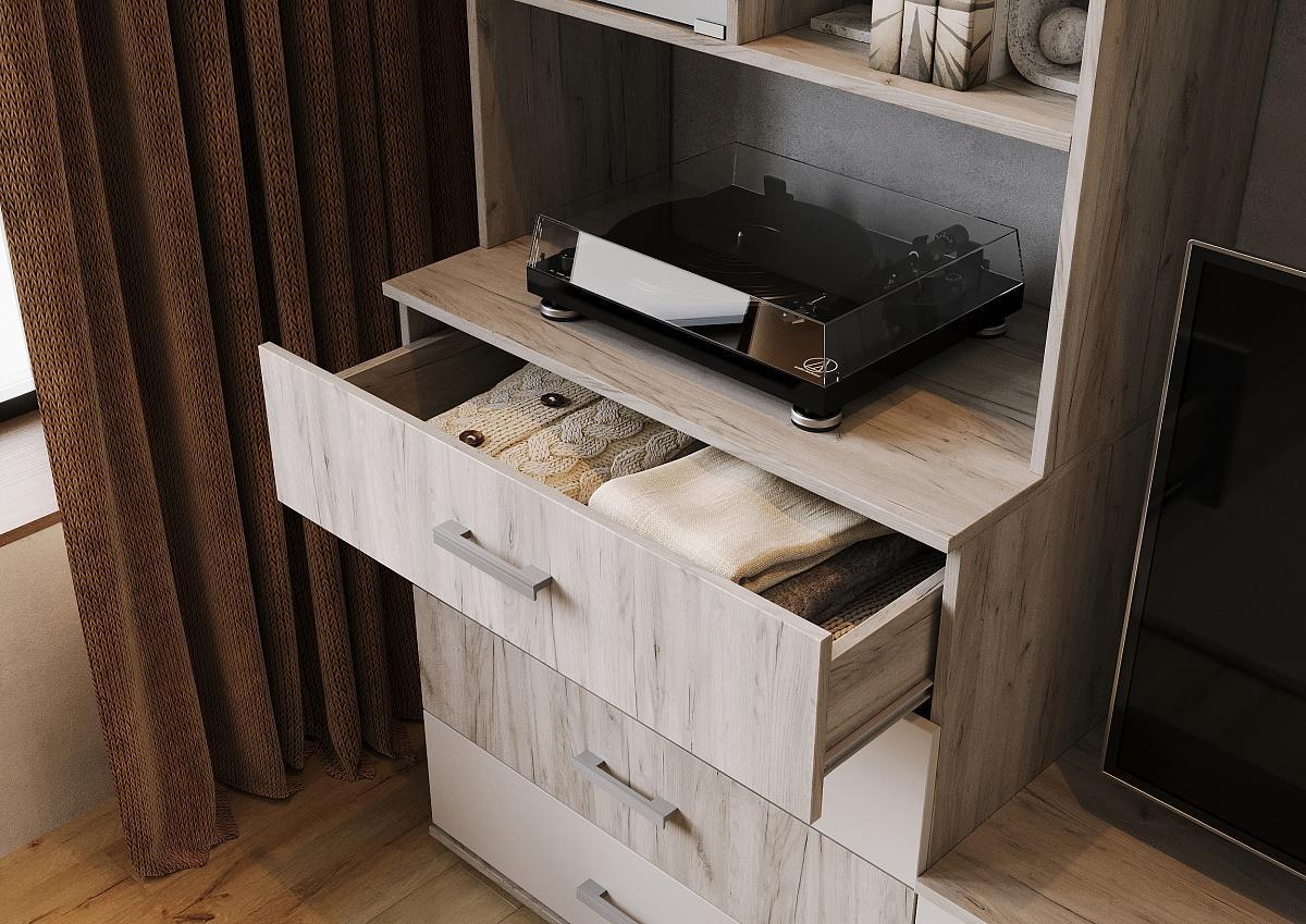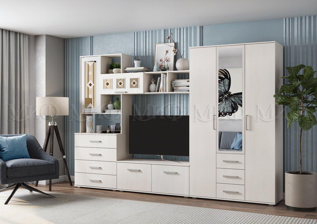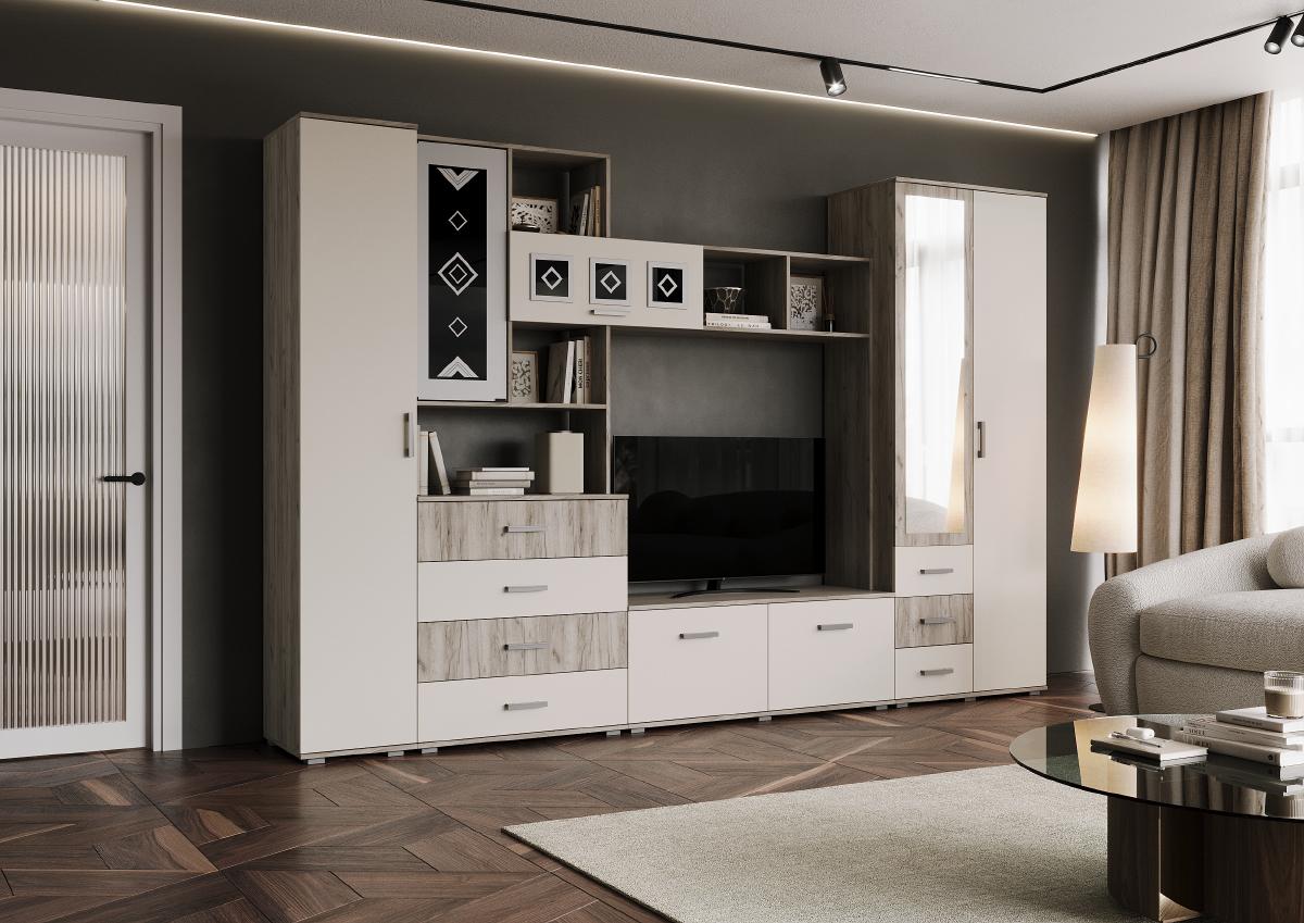 Модульная система для гостиной «Белла» — в модном исполнении, для рационального заполнения площади гостиной. Оптимальное и практичное решение для размещения всех необходимых вещей.