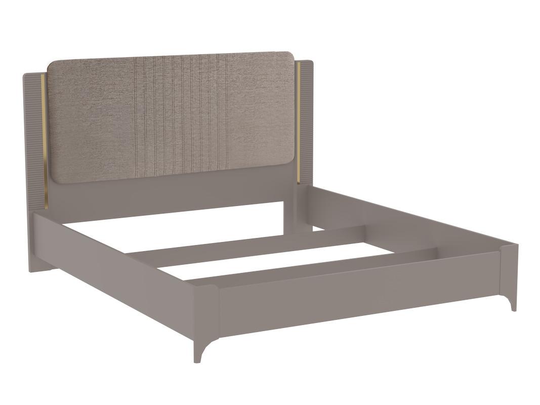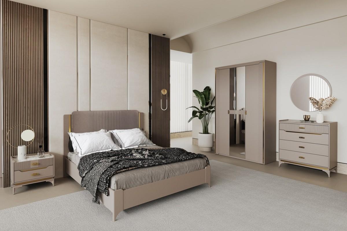 Спальня «Сиде» создана для того, чтобы вы могли наслаждаться максимальным комфортом, уютом и полноценным здоровым сном. На просторной кровати удобно расположиться, а мягкая спинка, обитая однотонной рогожкой или велюр, добавляет ей элегантности и отражает общую «спокойную» концепцию. В золотом оттенке выполнены металлические ручки на предметах мебели для создания завершенного образа. За функциональность и практичность отвечают надежные петли и направляющие с доводчиком.