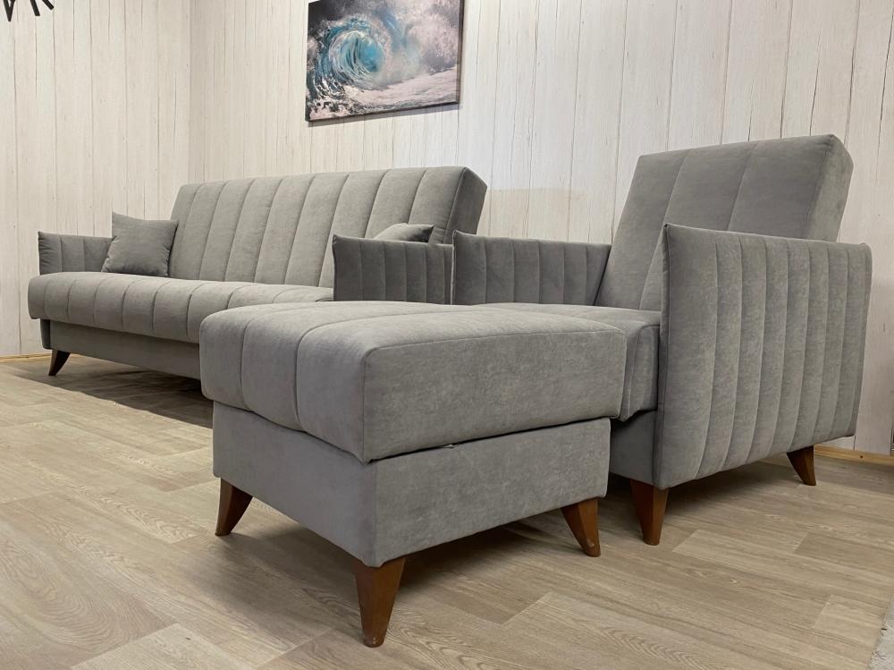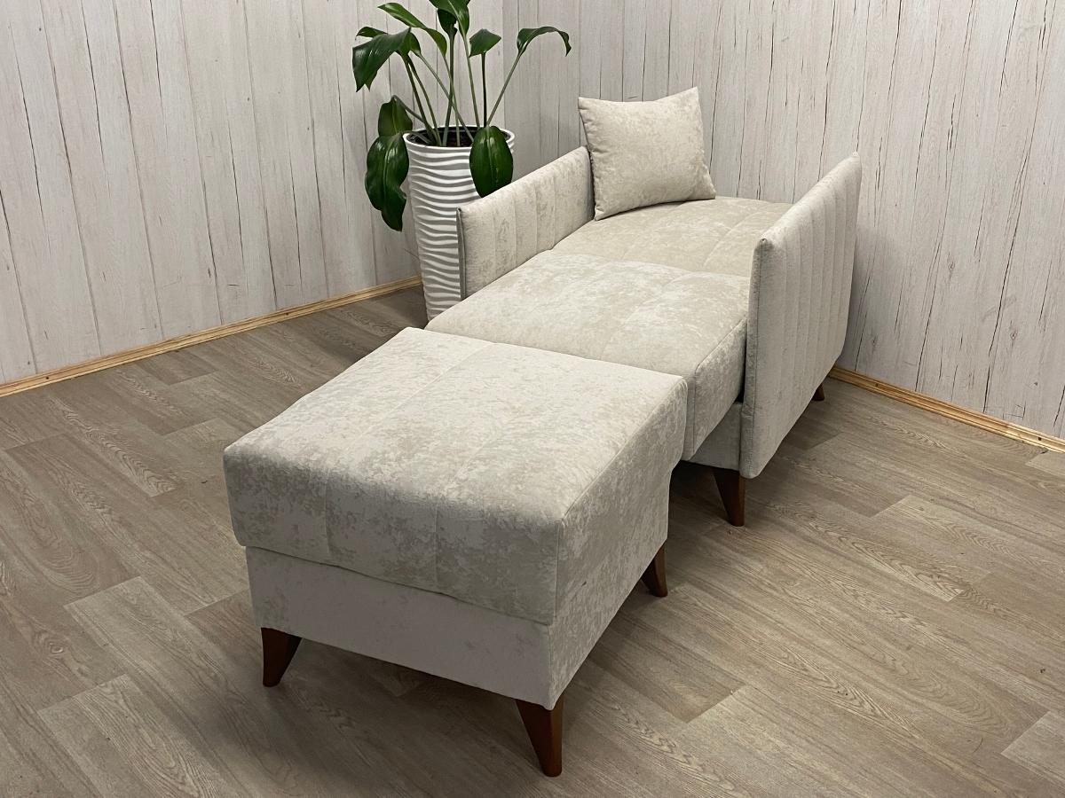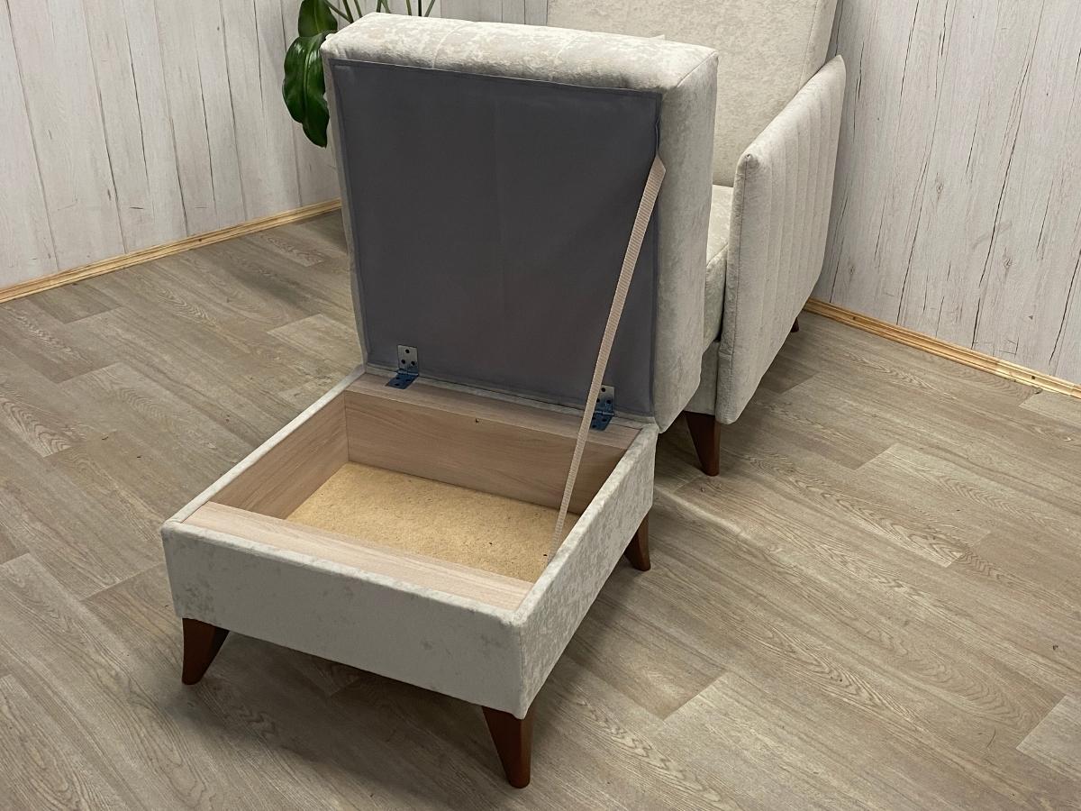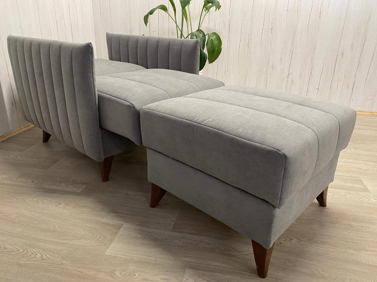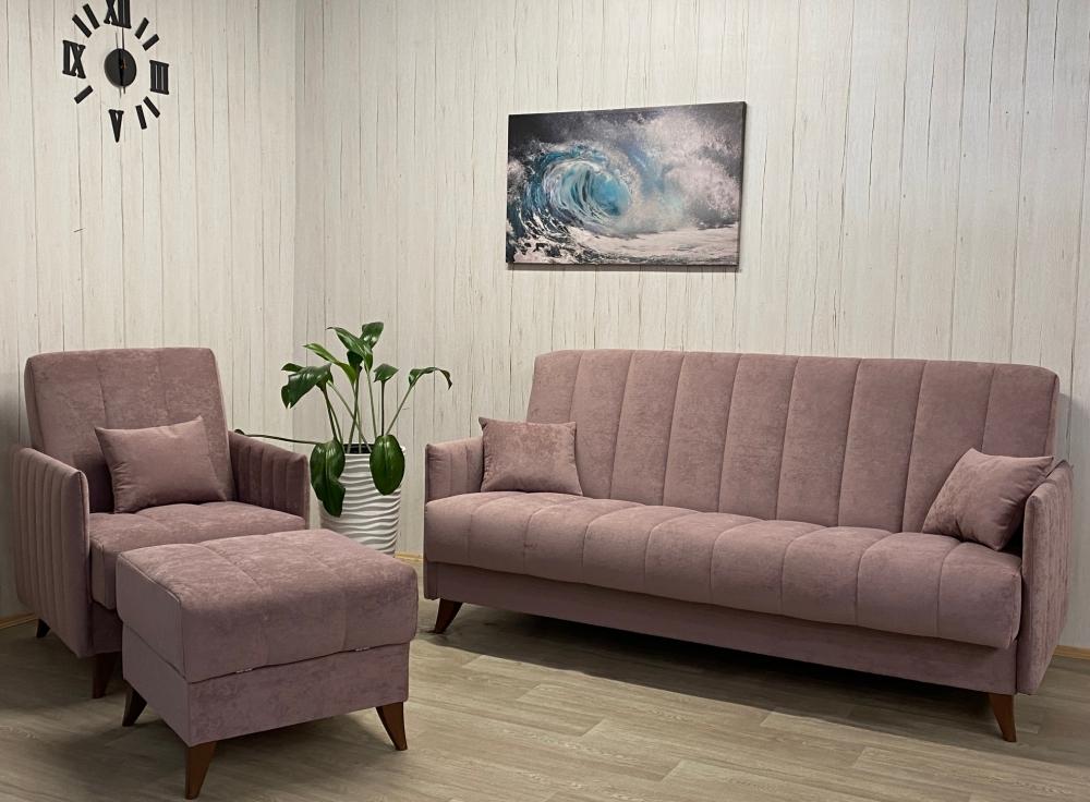 Диван: 2040*1000*990 мм. Кресло: 740*1000*990 мм. Пуф: 630*620*510 мм. Наполнение: независимый пружинный блок. Материал каркаса: ЛДСП, фанера, брус хвойных пород дерева.